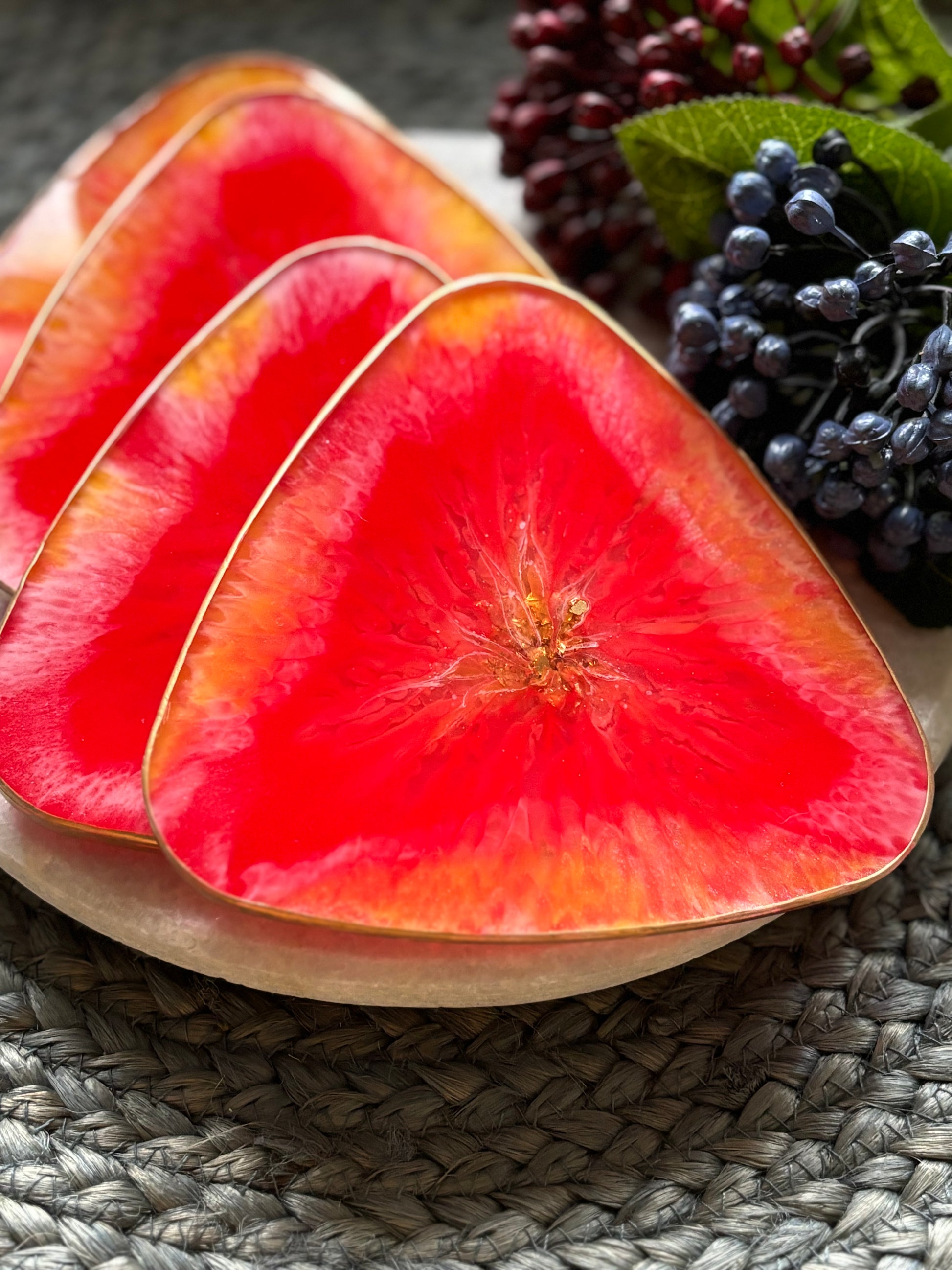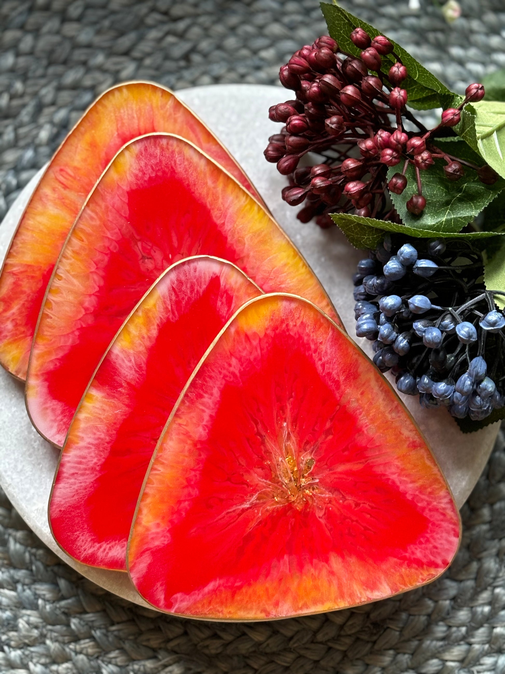 Expertly crafted from durable resin, this set of four Red Triangle Coasters are both stylish and functional. Protect your surfaces from water stains and scratches while adding a touch of modern design to your home. Each coaster is uniquely shaped as a triangle, adding a geometric flair to your living space.