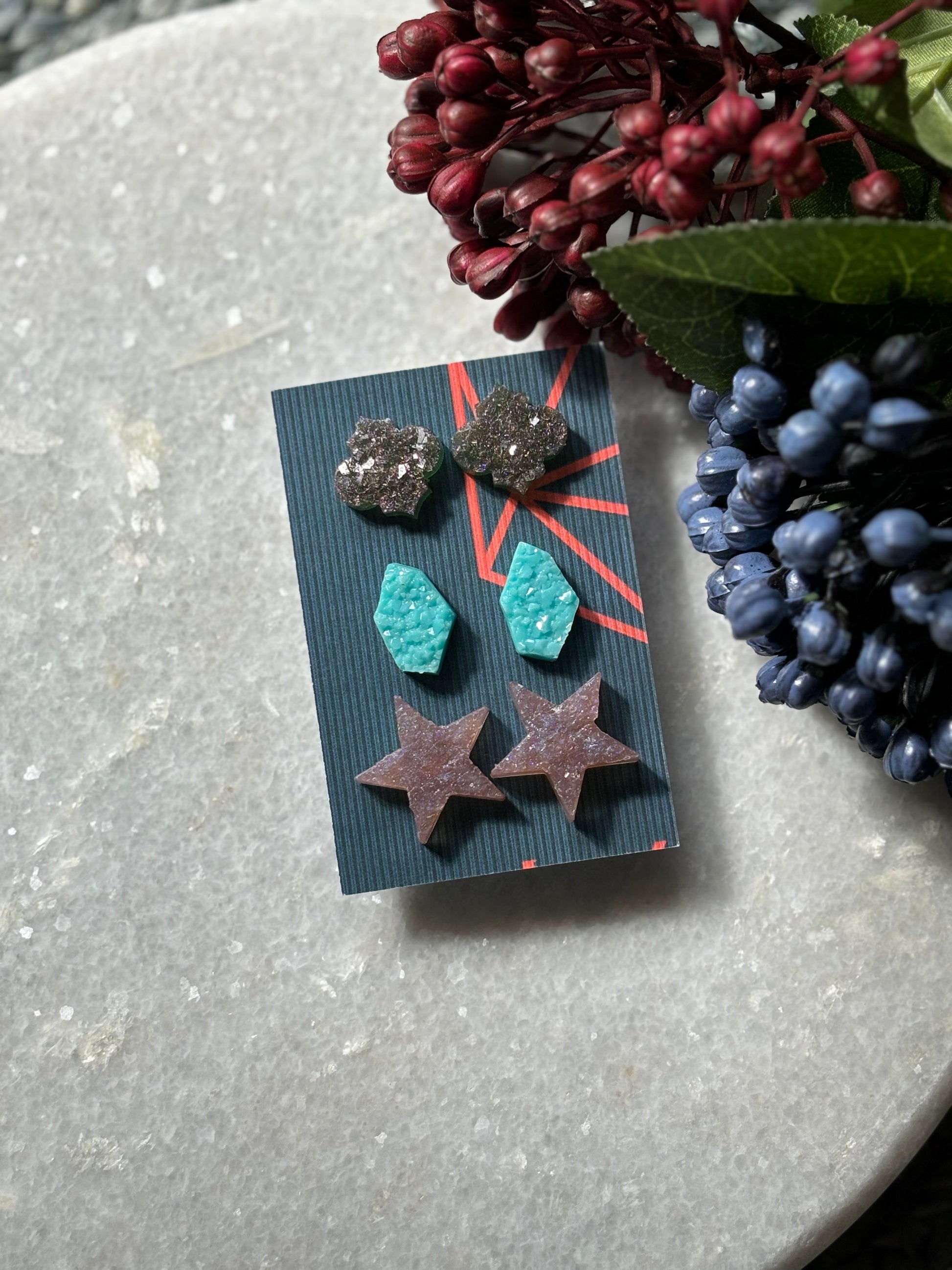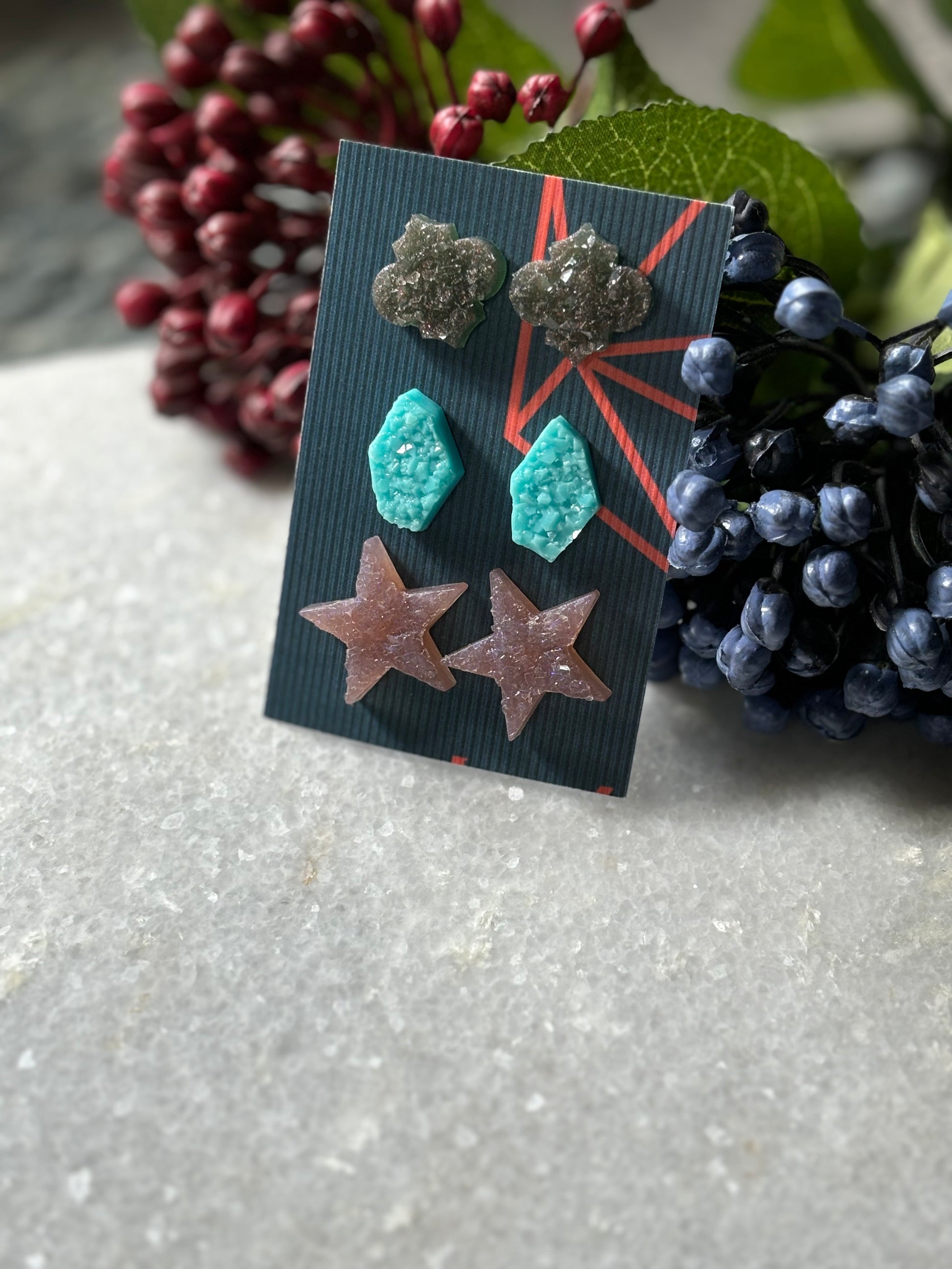 Expertly handcrafted with resin, this Stud Combo 1 adds a unique touch to any outfit. Made with quality materials, these studs are both durable and stylish. Enhance your look with the expert craftsmanship of these resin studs.