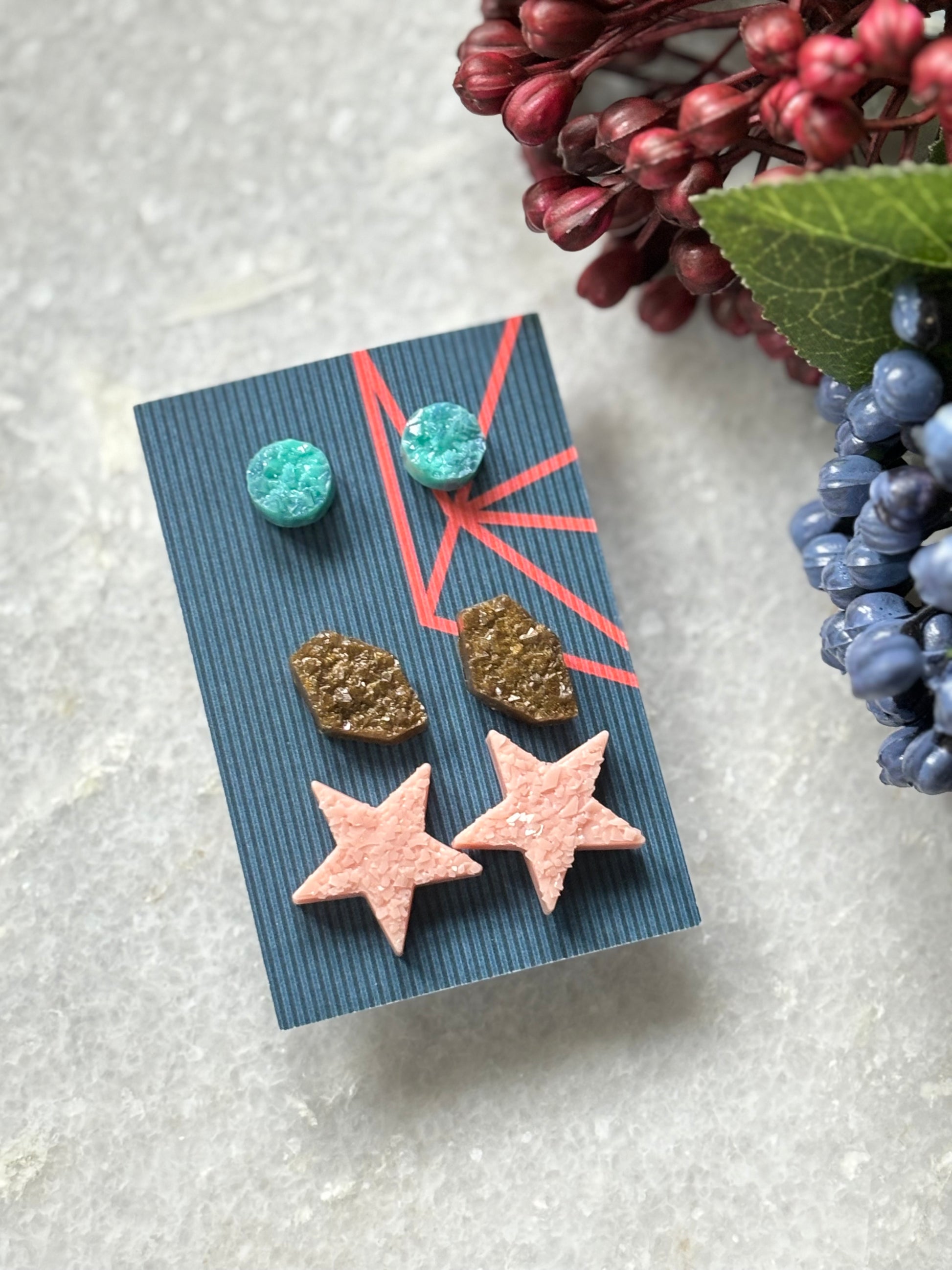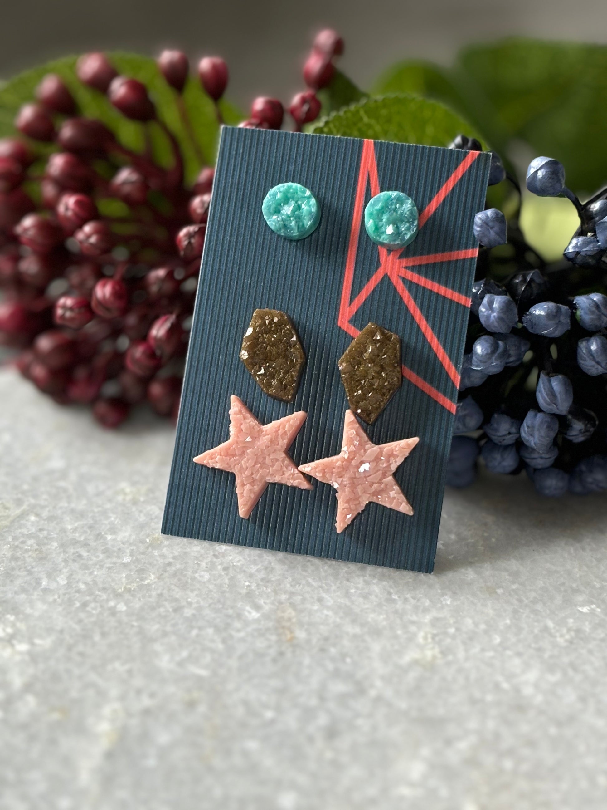 Expertly handcrafted with resin, this Stud Combo 1 adds a unique touch to any outfit. Made with quality materials, these studs are both durable and stylish. Enhance your look with the expert craftsmanship of these resin studs.