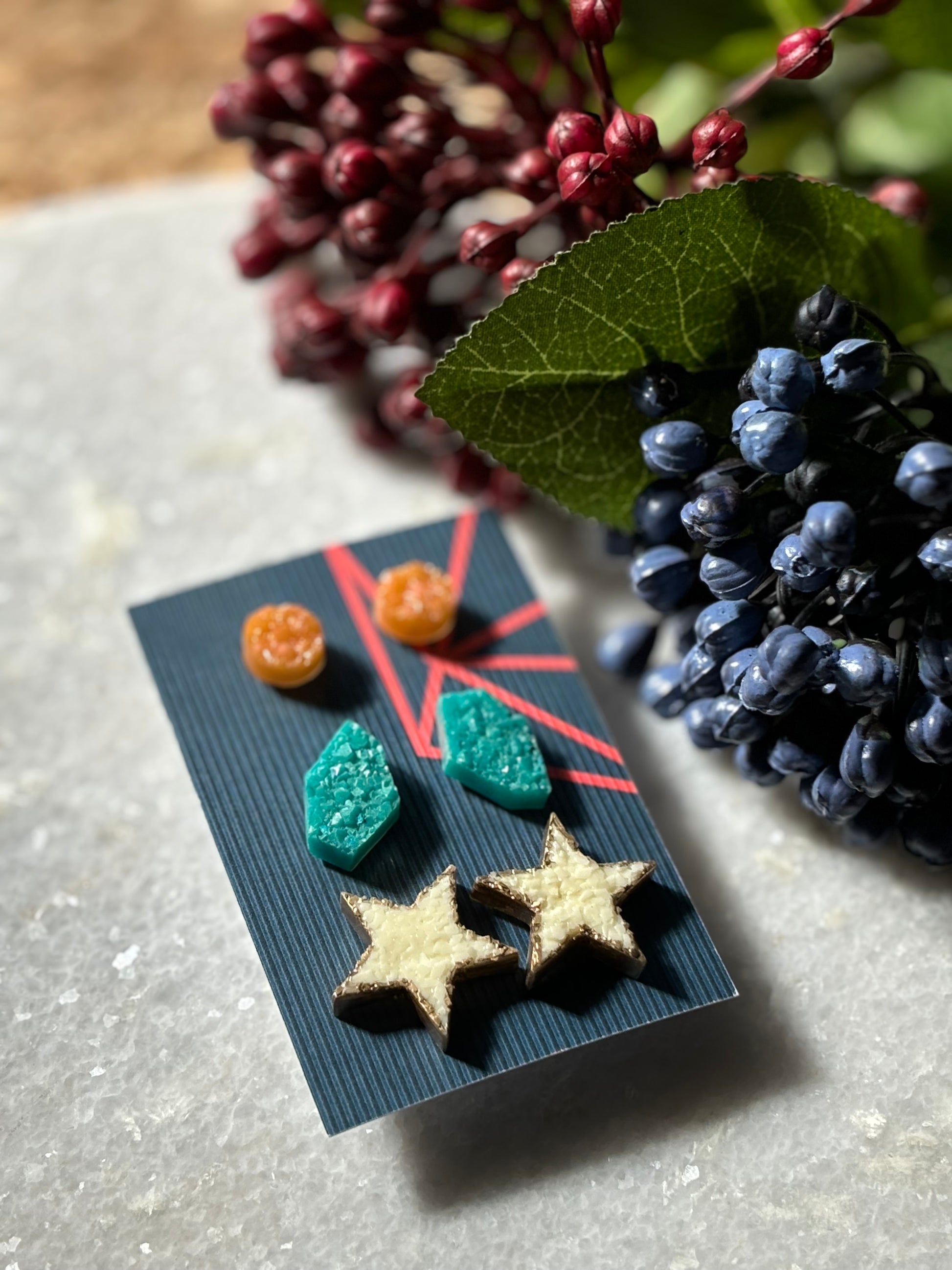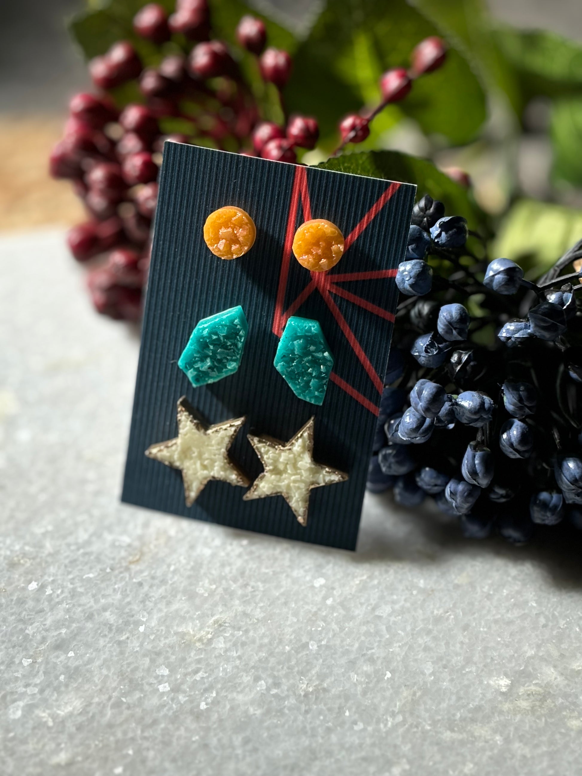 Expertly handcrafted with resin, this Stud Combo 1 adds a unique touch to any outfit. Made with quality materials, these studs are both durable and stylish. Enhance your look with the expert craftsmanship of these resin studs.