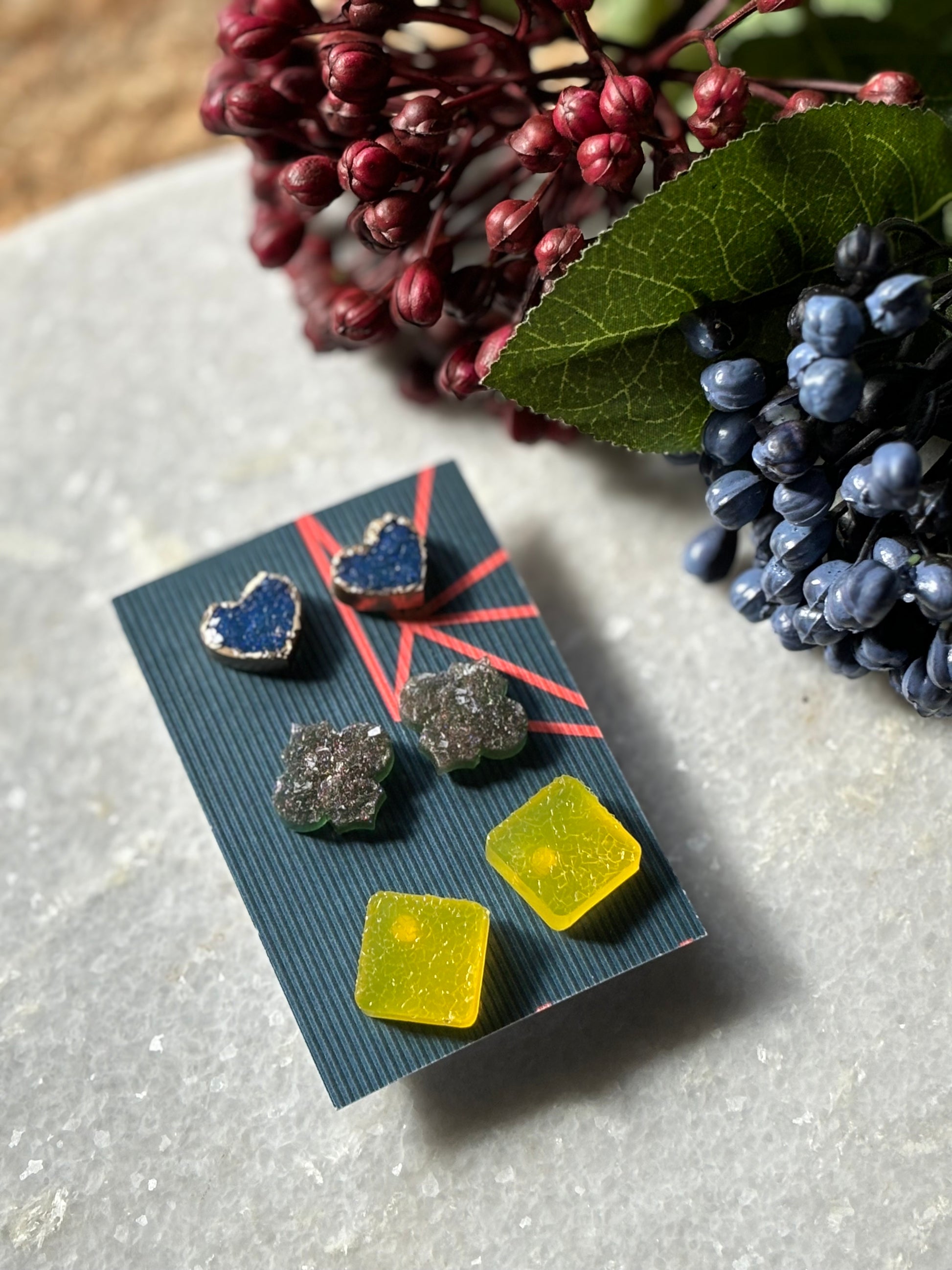 Expertly handcrafted with resin, this Stud Combo 1 adds a unique touch to any outfit. Made with quality materials, these studs are both durable and stylish. Enhance your look with the expert craftsmanship of these resin studs.